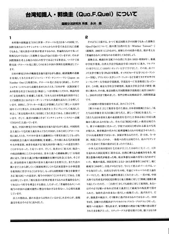 「台湾知識人・郭煥圭(Quo.F.Quei)について(『台湾の行方』書評)」(国際交流研究所 所長 永井務)